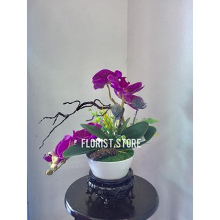 Gubahan orkid latex semi premium 5 tangkai pasu seramik rendah size l height : Gubahan orkid 2 tangkai untuk meja kopi ringkas mudah dan simple untuk diy sendiri.